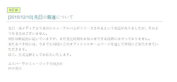 Giovedì della scorsa settimana Hidenobu Okita della Universal Music ha scritto sul sito deb ufficiale della cantante e cantautrice Utada Hikaru per informare i fan dell’artista che la notizia riportata dei media circa l’uscita di un nuovo album di Utada Hikaru prevista per la primavera dell’anno prossimo sarebbe falsa. Hidenobu Okita ha fatto sapere che nonostante la cantante stia in effetti lavorando a un nuovo album, il lavoro sta procedendo sporadicamente e non si è ancora arrivata al punto di poterne annunciare una data ufficiale di distribuzione. Okita ha anche sottolineato che se ci saranno ulteriori notizie circa il prossimo album di Utada Hikaru, queste saranno pubblicate sulla sua pagina web ufficiale.