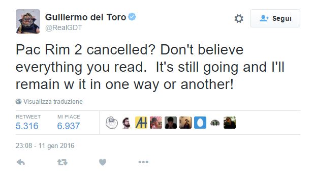 Lunedì di questa settimana il regista Guillermo del Toro (Hellboy, Il labirinto del fauno, Crimson Peak) ha pubblicato un nuovo messaggio attraverso il suo account di Twitter confermando che la produzione di un seguito di Pacific Rim è “ancora in corso” e che lui avrebbe continuato a lavorarci “in un modo o nell’altro”. Il messaggio sembra essere una risposta ad alcune voci che sostenevano la cancellazione di Pacific Rim 2. Già a Settembre dell’anno scorso, inoltre, Guillermo del Toro aveva dichiarato “Per quanto mi riguarda, il seguito di Pacific Rim non è da considerarsi scomparso”.