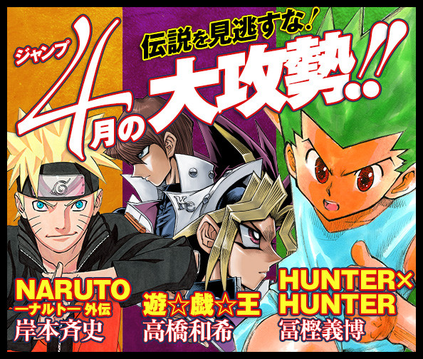 Martedì di questa settimana, il sito web ufficiale giapponese della rivista Weekly Shonen Jump edita dalla Shueisha ha pubblicato una nuova immagine per promuovere “I grandi blitz di Jump di Aprile!!”. In aggiunta alla storia auto-conclusiva di Naruto Gaiden, che uscirà il 25 Aprile, e la storia in due capitoli di Yu-Gi-Oh! che usciranno l’11 e il 18 Aprile, l’immagine mostra anche un’illustrazione di Hunter x Hunter.