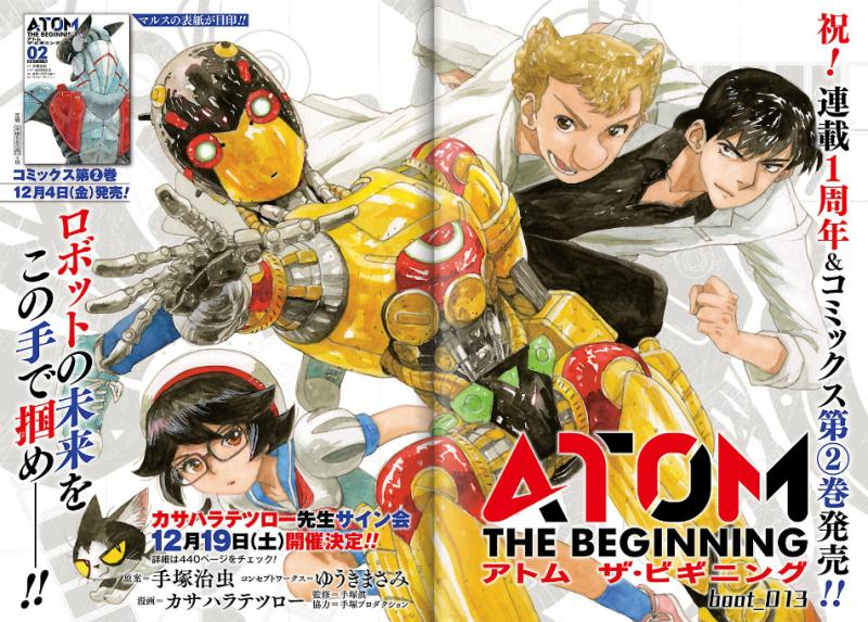 Tatsuo Kasahara ha lanciato la pubblicazione del manga di Atom the Beginning nel Dicembre del 2014, sulle pagine della stessa Monthly Hero. Atom the Beginning è stato pensato come un prequel del manga Astro Boy di Osamu Tezuka. Il figlio di Tezuka, Makoto Tezuka, ha curato la supervisione editoriale del manga e la serie è stata realizzata in collaborazione con la Tezuka Productions. Masami Yuuki (Patlabor the Mobile Police, Birdy the Mighty creator) ha curato il “concept works” della serie.