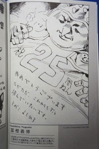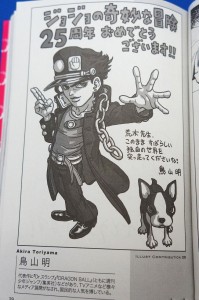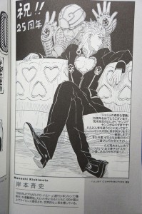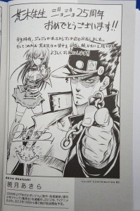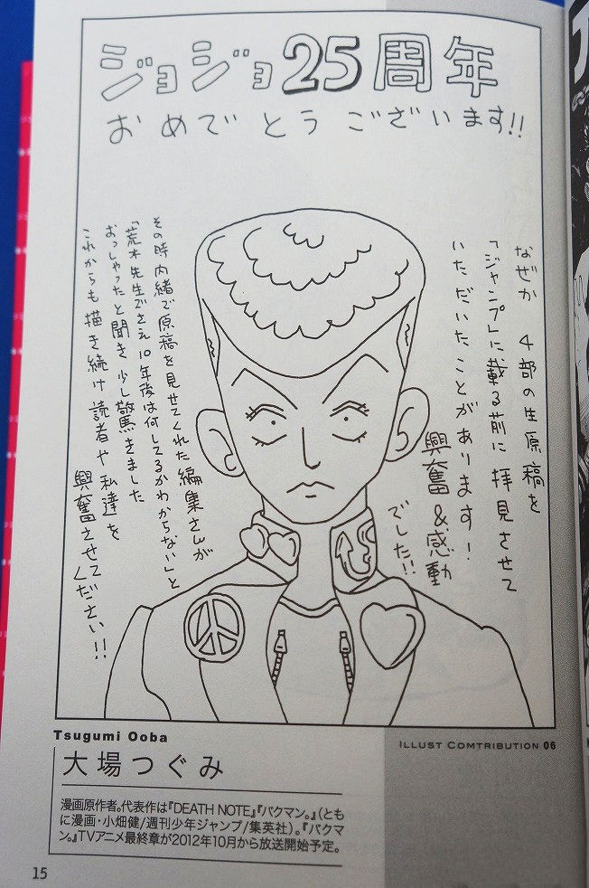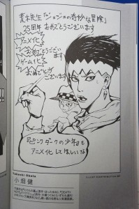 Sebbene non sia una disegnatrice ma una scrittrice anche Tsugumi Oba (Death Note) vuole fare la sua parte, e ci presenta questo semplice disegno di Josuke Higashikata. Solo uno schizzo, certo, ma per fare gli auguri ad Araki non serve essere maestri della matita.
