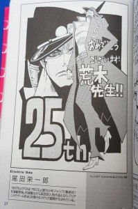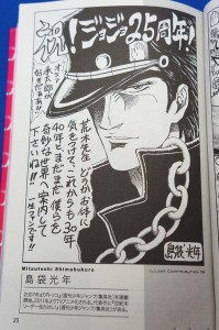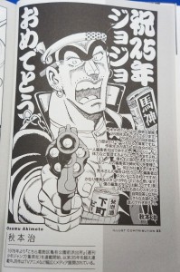 Anche Osamu Akimoto, autore di Kochira Katsushika-ku Kameari Kōen Mae Hashutsujo, manga in corso dal 1976, ci mostra la sua versione di Jotaro che ammetto avere avuto difficoltà a riconoscere, ma quelle catene sono inconfondibili (all’inizio pensavo fosse Guido Mista di Vento Aureo, quinta serie).