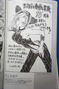 Le CLAMP non potevano che scegliere un personaggio femminile da illustrare: Jolyne Kujo, protagonista della sesta serie Stone Ocean. Personalmente avrei voluto vedere una loro versione di Lisa Lisa (Battle Tendency, seconda serie).