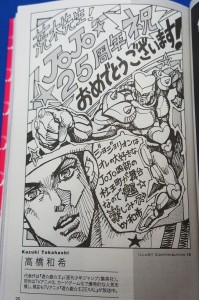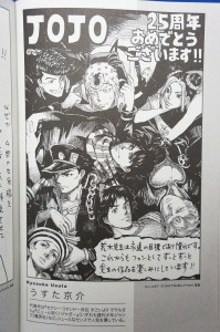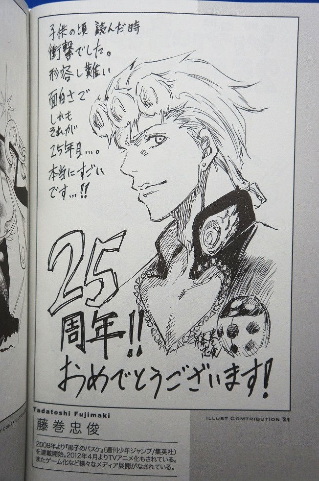 Anche Tadatoshi Fujimaki autore di Kuroko no Basket, sebbene lavori su un genere diverso fa gli auguri a Jojo e disegna un personale Giorno Giovanna con tanto di coccinella (protagonista della quinta serie, Vento Aureo).