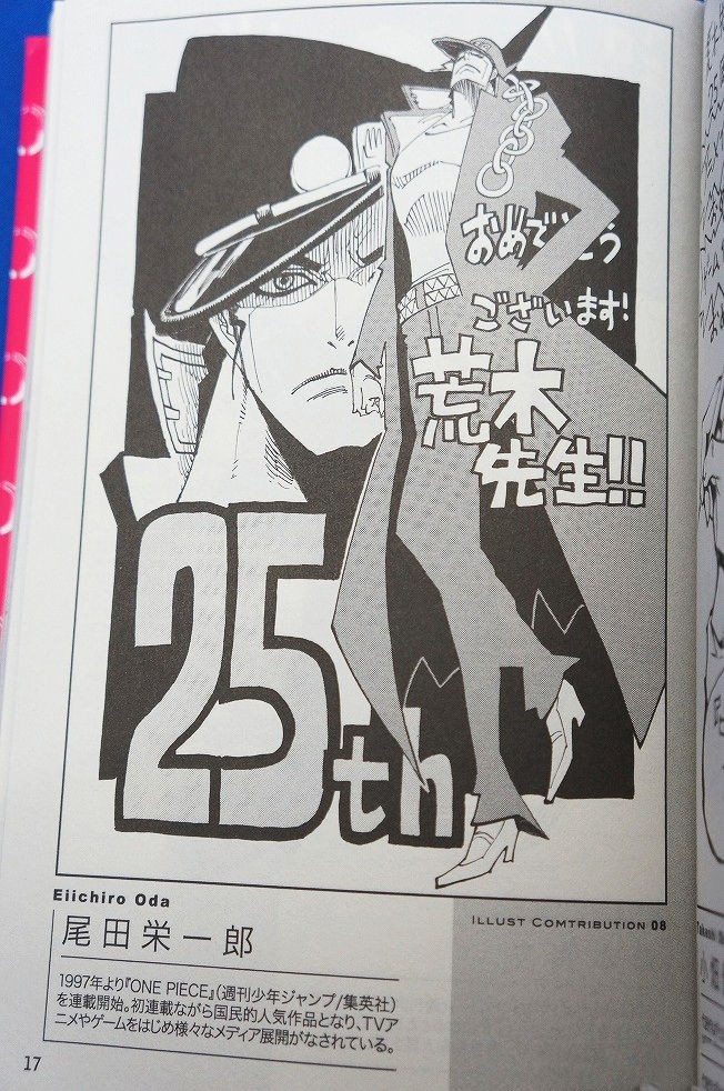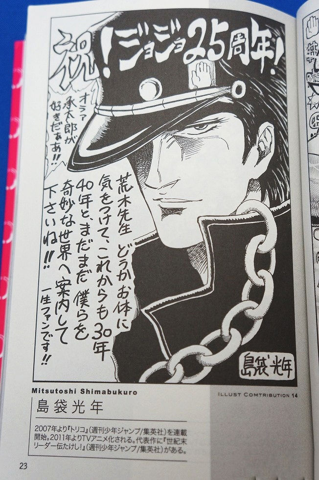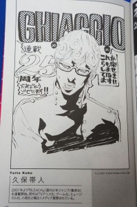Non poteva mancare l’omaggio di Tite Kubo, che ci presenta una versione di Ghiaccio (boccoli inconfodibili) dalla quinta serie Vento Aureo. Un disegno molto semplice, ma l’autore di Bleach riesce pienamente a interpretare un personaggio di un altro manga senza perdere il suo inconfodibile stile.