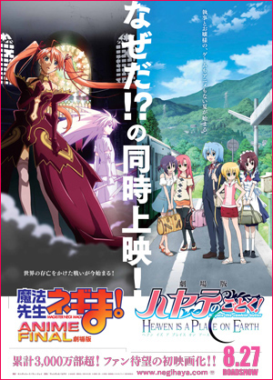 Il lungometraggio d’animazione di Mahō Sensei Negima! Anime Final in uscita il 27 Agosto in double bill o double feature (si tratta di un fenomeno ormai poco comune nell’industria cinematografica che consiste nel mostrare due film al prezzo di uno) insieme a Hayate no Gotoku! Heaven is a Place on Earth, infatti, è riuscito a vendere per i due eventi di sabato più di 800 biglietti in pochissimo tempo.