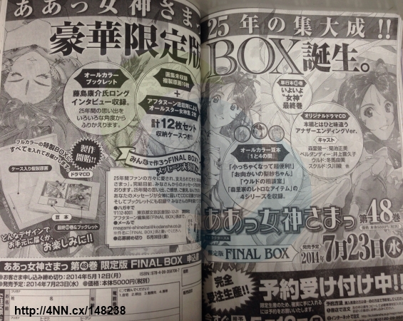 La Kodansha ha anche fatto sapere che il 48esimo e ultimo volumetto del manga di Oh Mia Dea! sarà messo in vendita in due versioni, una regolare e un’altra limitata al prezzo di 5,000 yen (circa 35€) il 23 Luglio. L’edizione limitata al momento porta il nome di Limited-Edition Final Box e conterrà oltre al 48esimo volume del manga anche un drama CD prodotto appositamente per l’occasione. Si tratta, infatti, di un finale alternativo che differisce in qualche modo da quello disegnato da Fujisjima, e vedrà la partecipazione di Masami Kikuchi nei panni di Keiichi Morisato, Kikuko Inoue in quelli di Belldandy, Yumi Touma in quelli di Urd, Aya Hisakawa in quelli di Skuld e altri doppiatori.