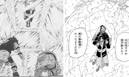 Arte del Ghiaccio (Hyoton): arte segreta del villaggio della Nebbia, ereditaria della famiglia Yuki e composta da Acqua e Vento. Unico utilizzatore che abbiamo visto all’opera è Haku: quest’arte permette di creare il ghiaccio a partire dal chakra o di congelare persone e cose. Haku sembra mostrare un’altra abilità, egli infatti si muove a velocità incredibili usando degli specchi costruiti con quest’arte, com’è possibile? Trasforma in ghiaccio il suo corpo e lo “lancia” tra uno specchio e l’altro? Proprio durante la guerra vediamo Haku colpire un nemico (Sai) senza che esso sia all’interno della gabbia di specchi, come ha fatto a “teletrasportarsi”?