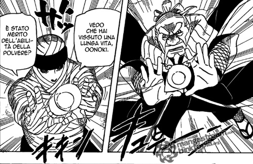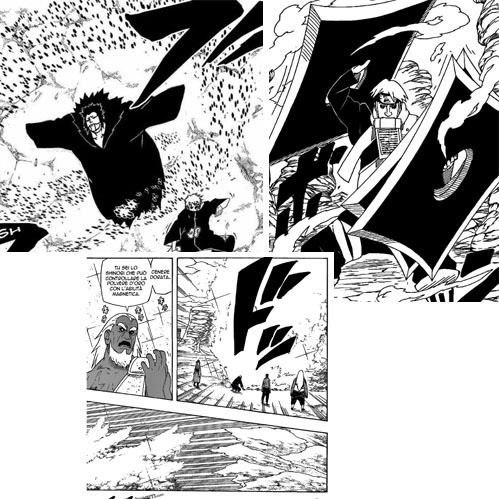 Un paio di considerazioni: com’è possibile che ninja di paesi diversi utilizzino la stessa abilità innata? Potrebbe essere che alcuni membri di clan con tali capacità siano fuggiti verso altri lidi (chi possedeva un’abilità innata, a detta di Haku, era perseguitato) creando un nuovo ceppo della mutazione in un altro paese? Come è possibile che Muu abbia “passato” la sua abilità innata ad Onoki? Infatti proprio il vecchietto dice che tale abilità gli è stata insegnata dal suo maestro, benchè noi sappiamo bene che le arti innate non si possono insegnare. Inoltre mancano all’appello due abilità ancora ignote, se ho azzeccato gli elementi esse sarebbero Aria+Terra ed Aria+Fulmine, cosa uscirebbe da tali combinazioni?