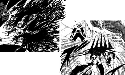Arte della Fiamma (Enton): arte che abbiamo visto usare da Sasuke ed Itachi. Di quest’abilità abbiamo visto due sole tecniche, Amaterasu (utilizza la Fiamma Nera incendiando al solo sguardo) e Kagutsuchi (manipola la forma della Fiamma Nera), entrambe utilizzabili solo tramite Mangekyou Sharingan. Partiamo con le ipotesi: innanzitutto da cosa è composto? Secondo me la risposta è sotto i nostri occhi, sono fiamme oscure, direi che potrebbero essere Fuoco e Ombra. Questo spiegherebbe anche l’altro mio dubbio: perchè solo un Uchiha? Perchè solo un Mangekyou Sharingan? Ovviamente, gli Uchiha sono personalizzazione dell’odio e dell’elemento Yin (ereditato dal Rikudou) ed il fuoco è il loro elemento caratteristico, unendoli abbiamo l’arte della Fiamma mentre il Mangekyou Sharingan “sbloccherebbe” il chakra Yin necessaro.