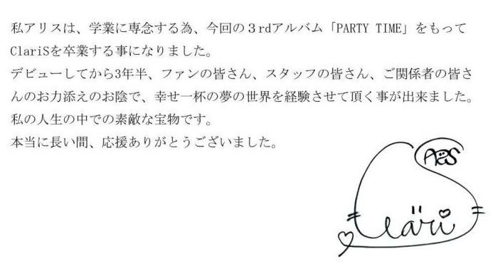 Lunedì di questa settimana, la Sony ha annunciato, attraverso il sito web ufficiale del duo ClariS, che Alice, metà del suddetto duo, lascerà il gruppo il 4 Giugno, il giorno in cui il terzo album delle ClariS intitolato PARTY TIME sarà messo in vendita.