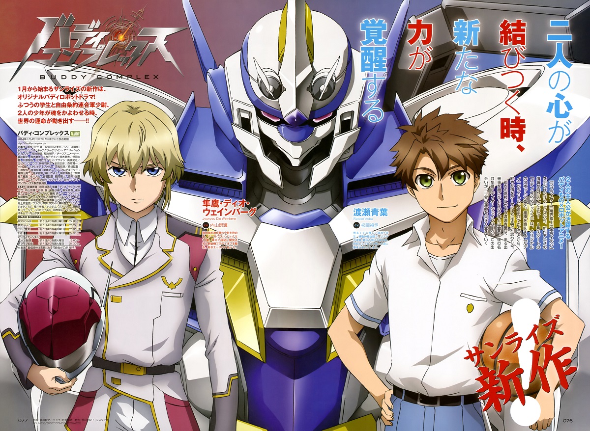 Protagonista della vicenda è Aoba Watase, un ragazzo spensierato che frequenta un istituto superiore di Tokyo. Il giorno della cerimonia d’apertura tuttavia, conoscerà il giovane Weinberg, e da quel momento la sua vita cambierà. Presentato dalla Sunrise come un ritorno agli anime mecha in vecchio stile Buddy Complex è il nuovo lavoro del gruppo Hajime Yatate, noto per i suoi contributi al meta-universo Gundam. (Dopo Kakumeiki Valvrave non so se fidarmi della Sunrise ndRegola)