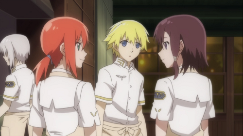 La struttura di questo anime mi è parsa sempre più chiara episodio dopo episodio, mentre infatti le sottotrame politiche e i drammi umani venivano lentamente svelati, quelli che risaltavano all’occhio erano i soliti appuntamenti tipici di ogni serie a tema scolastico che si rispetti. In questi due episodi abbiamo visto adattati due momenti classici: la lezione in piscina, che però avviene presso un lago, e il festival culturale, poichè la “classe” dei protagonisti ha messo su un piccolo “chiosco” per racimolare qualche soldo. La motivazione di questa scelta mi appare per ora abbastanza chiara: gli sceneggiatori volevano guadagnare tempo. In quanto nei prossimi episodi i personaggi si avvicineranno al loro obiettivo, e l’addestramento come soldati che con tanto impegno portano avanti dovrà necessariamente dare i suoi frutti, anche in virtù del fatto che, del misterioso e aggressivo nemico apparso all’orizzonte, non sappiamo ancora niente. Nel frattempo i due protagonisti continuano ad attivare flag a ripetizione: lo sceneggiatore si sta divertendo veramente tanto ad avvicinarli e allontanarli a ripetizione, un po’ come accade in ogni commedia romantica, aspettando il momento in cui il povero Kal-el verrà a conoscenza del passato e della vera identità di Claire. Continuano, infine, ad accumularsi i dettagli di questa serie che ricordano Last Exile: Aoi Yuki, doppiatrice di Claire Cruz, nel 2011 diede la voce a Colette di Last Exile: Fam, the Silver Wing.