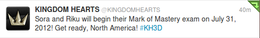 Nella giornata di oggi, la holding nipponica Square Enix ha annunciato con un tweet la data di uscita in territorio nord-americano del proprio nuovo titolo in collaborazione con Disney chiamato Kingdom Hearts 3D [Dream Drop Distance]: “Sora and Riku will begin their Mark of Mastery exam on July 31, 2012! Get ready, North America!“. La data dunque è 31 Luglio di quest’anno, data che può dare un indizio su quella europea che è stata recentemente cambiata da “27 Luglio” a un fin troppo generico “2012”.