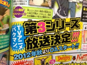 Il terzo e il quarto numero del prossimo anno della rivista Weekly Shonen Jump edita dalla casa editrice Shueisha, usciti in un unico maxi formato che li include entrambi, ha annunciato Lunedì la terza stagione animata del manga di Takeshi Obata e Tsugumi Ohba, Bakuman. La terza stagione dovrebbe essere trasmessa in Giappone l’anno prossimo, in autunno.