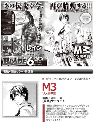 Venerdì di questa settimana, il numero di Maggio della rivista Monthly Comic Blade edita dalla Mag Garden ha annunciato che l’anime di M3 – Sono Kuroki Hagane, dal regista di Sailor Moon, Junichi Sato, la sceneggiatrice di anohana Mari Okada, e il mecha designer di Macross Shoji Kawamori, e prodotto dalla Satelight, riceverà un adattamento cartaceo. Il manga sarà disegnato da Kazuomi Minatogawa e il primo capitolo dello stesso sarà pubblicato sul prossimo numero della rivista in vendita il 30 Aprile.
