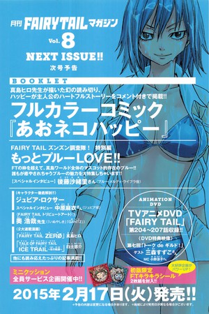 Giovedì di questa settimana, con la pubblicazione del settimo numero della rivista Monthly Fairy Tail edita dalla Kodansha, è stato dato l’annuncio che Hiro Mishima pubblicherà sulle pagine della rivista un manga autoconclusivo intitolato Aoneko Happy (Happy il gatto azzurro). Il manga sarà pubblicato sul prossimo numero di Monthly Fairy Tail, in vendita in Giappone il 17 Febbraio di quest’anno. Aoneko Happy sarà uno spinoff del manga Fairy Tail e avrà come protagonista principale Happy. Sarà, inoltre, pubblicato interamente a colori.