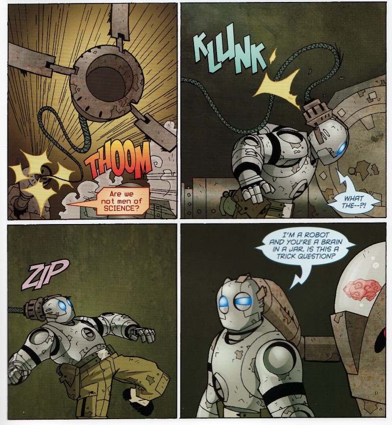 In attesa di leggere l’ultimo capitolo del quinto volume, vi lascio con un paio di scan emblematiche dello stile del fumetto. Riparleremo di Atomic Robo quando uscirà il sesto volume o il cortometraggio!