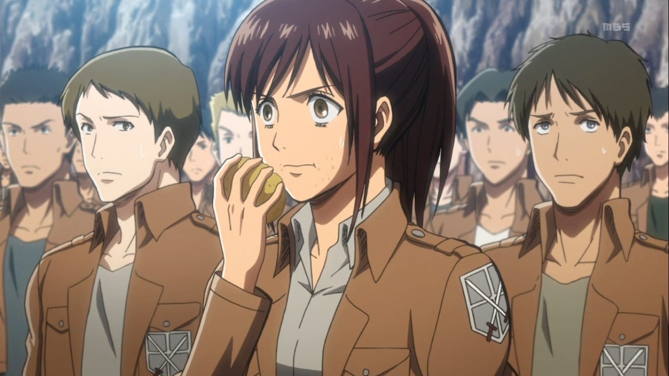 Commento: Devo ammettere che quest’episodio l’ho visto abbastanza di passaggio, racconta un po’ com’è la vita sotto l’esercito per Eren, ma non mi ha colpito poi tanto. Una cosa, però, lo trovata realizzata male, il compagno d’armi che ha un colpo di fulmine appena vede Mikasa ha una reazione che io reputo davvero eccessiva nei confronti di Eren, soprattutto perché il nostro protagonista ha solo detto a Mikasa di tagliarsi i capelli e, anche dopo il taglio, la capigliatura non si è accorciata poi troppo, quindi ritengo che l’uscita fatta sia davvero strana e un po’ troppo oltre quella che potrebbe essere una normale reazione. E voi cosa ne pensate? Avete visto tra i tanti personaggi presentati qualcuno che vi ha particolarmente catturato? Io devo ammettere che sono rimasto affascinato dalla “Ragazza Patata” personaggio davvero atipico che mi ha lasciato davvero di stucco.