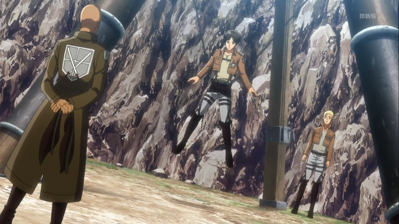 Riassunto: In quest’episodio facciamo un balzo in avanti rispetto a come viene raccontata la trama nella versione cartacea e vediamo i primi tempi di Eren nell’esercito e di come, seppur molto motivato, all’inizio abbia incontrato non poche difficoltà. Una delle principali difficoltà incontrate dal nostro protagonista è lo scontro ideologico per cui i vari cadetti si sono arruolati nell’esercito; lui si è unito per combattere i giganti e poter riconquistare la Terra, mentre, molti suoi compagni, si sono iscritti per poter soggiornare nelle mura più interne, o per mettersi al servizio del re. Eren non è un ragazzo dal carattere facile e tende a scaldarsi molto velocemente per difendere le proprie idee e questo rischia di portarlo vicino ad una rissa già la prima notte da cadetto. Alla fine la situazione riesce a risolversi e il nostro protagonista riesce a passare la prova di attitudine richiesta per diventare un cadetto effettivo.