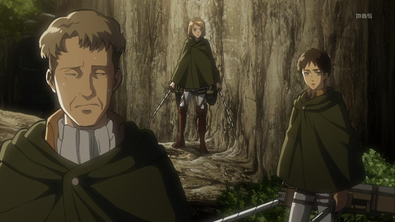 Riassunto : In quest’episodio vediamo il proseguimento del piano del capitano Erwin che ha il preciso scopo di catturare viva la persona all’ interno del gigante, anche se prima vuole farla soffrire per tutte le perdite inflitte alla legione esplorativa causando la morte di cento suoi commilitoni che hanno provato ad intralciarla. Il piano di cattura fallisce, poiché l’occupante del gigante femmina richiama i giganti per farsi mangiare piuttosto che farsi catturare viva. A fine episodio scopriamo che in realtà, l’occupante, non è morto, ha fatto mangiare dai giganti solo il suo corpo da gigante e approfittato della decomposizione del suo corpo si è nascosto spacciandosi per membro della legione esplorativa con lo scopo di attaccare Eren.