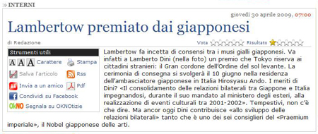 Meno di un mese fa un quotidiano a tiratura nazionale come l’italico il Giornale, testata fondata da Indro Montanelli e diretta attualmente da Mario Giordano, riportava la notizia di un’onoreficenza conferita all’onorevole Lamberto Dini da parte del Giappone. Per l’esattezza stiamo parlando del Gran Cordone dell’Ordine del Sol Levante, titolo riconosciuto a Dini per i suoi sforzi nel “consolidamento delle relazioni bilaterali tra Giappone e Italia“, impegno che si sarebbe accollato durante il suo mandato come Ministro degli Esteri, nel governo 1996-2001. Nell’articolo de il Giornale si legge, purtroppo, un’espressione che all’attuale governo giapponese, e per ovvie ragione, non è andata molto a genio: “Lambertow fa incetta di consensi tra i musi gialli giapponesi“.