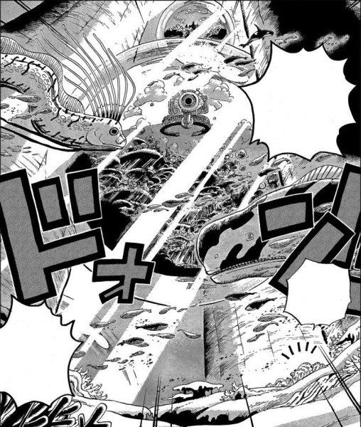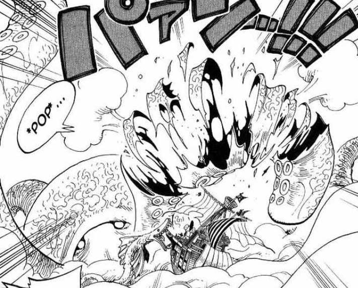 PS. Il mostro marino a chiazze che compare davanti l’Isola degli uomini pesce nella prima immagine in alto, era già comparso prima di oggi nella fascia di bonaccia (come si vede nella piuttosto nota immagine a destra, quando sollevò la povera Going Merry).