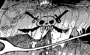 La settimana scorsa avevo sollevato dubbi sulla natura del capitano Van Der Decken e dei membri della sua ciurma: uomini pesce o spiriti maligni come vuole la tradizione? Un piccolo particolare comparso nel capitolo 605 può venirci in aiuto. Come si può osservare dalle sue vele, il simbolo dell’Olandese Volante è un teschio con denti piuttosto allungati (vedi immagine a destra); ebbene nel capitolo 605 (immagine a sinistra), si può osservare, nel
