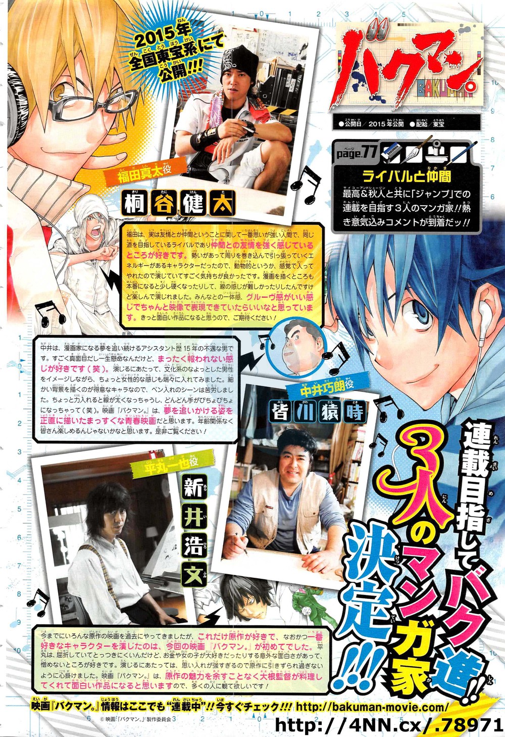 Takeru Satoh (Kenshin, Kamen Rider Den-O, Beck, Kanojo wa Uso o Ai Shisugiteru, Ryōmaden) interpreterà Moritaka Mashiro, un ragazzo la cui più grande aspirazione è quella di diventare un disegnatore di manga, mentre Ryunosuke Kamiki (Il castello errante di Howl, Summer Wars, Arrietty – Il mondo segreto sotto il pavimento, The Princess and the Pilot) interpreterà il suo compagno di classe e collaboratore Akito Takagi. Il film racconta la storia di Mashiro e Takagi e delle sfide che dovranno affrontare per diventare dei mangaka.