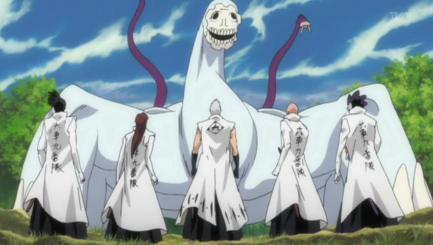 Riassunto: Shinji svela ad Urahara che negli ultimi mesi molta gente è sparita senza motivo nel Rukongai lasciando solo i vestiti, e per questo si suppone che essi abbiano perso la rispettiva forma umana. Kensei, a capo della nona squadra e il vice-capitano Mashiro stanno investigando il luogo delle sparizioni e vedono che un bambino sta per essere ucciso da un gigantesco Hollow.