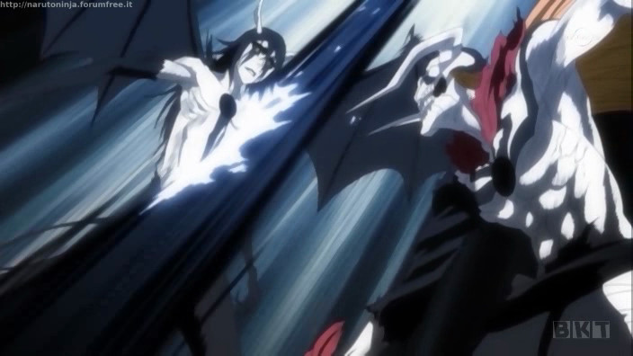 Riassunto: Il cero oscuras di Ulquiorra ha colpito in pieno petto l’ormai inerme ichigo, letteralmente forandolo, trapassandolo da parte a parte, cadendo dalla colonna di Las Noches, inerte. Orihime, disperata, gli para la caduta usando un suo scudo, correndogli incontro, per cercare di curarlo. Ulquiorra le impedisce di avvicinarsi, ma un tempestivo e coraggioso Ishida interviene, carcando di dar il tempo necessario a Orihime di curare Ichigo. Fin da subito tenta di creare una strategia vincente, cercando un punto cieco, una qualche debolezza del suo avversario, magari puntando sulla sua velocità. Ma il suo avversario è il 4° Espada, al secondo stadio di rilascio. Un rapido sonido, e Ulquiorra gli si para di lato, braccio alla mano, fratturandolo.
