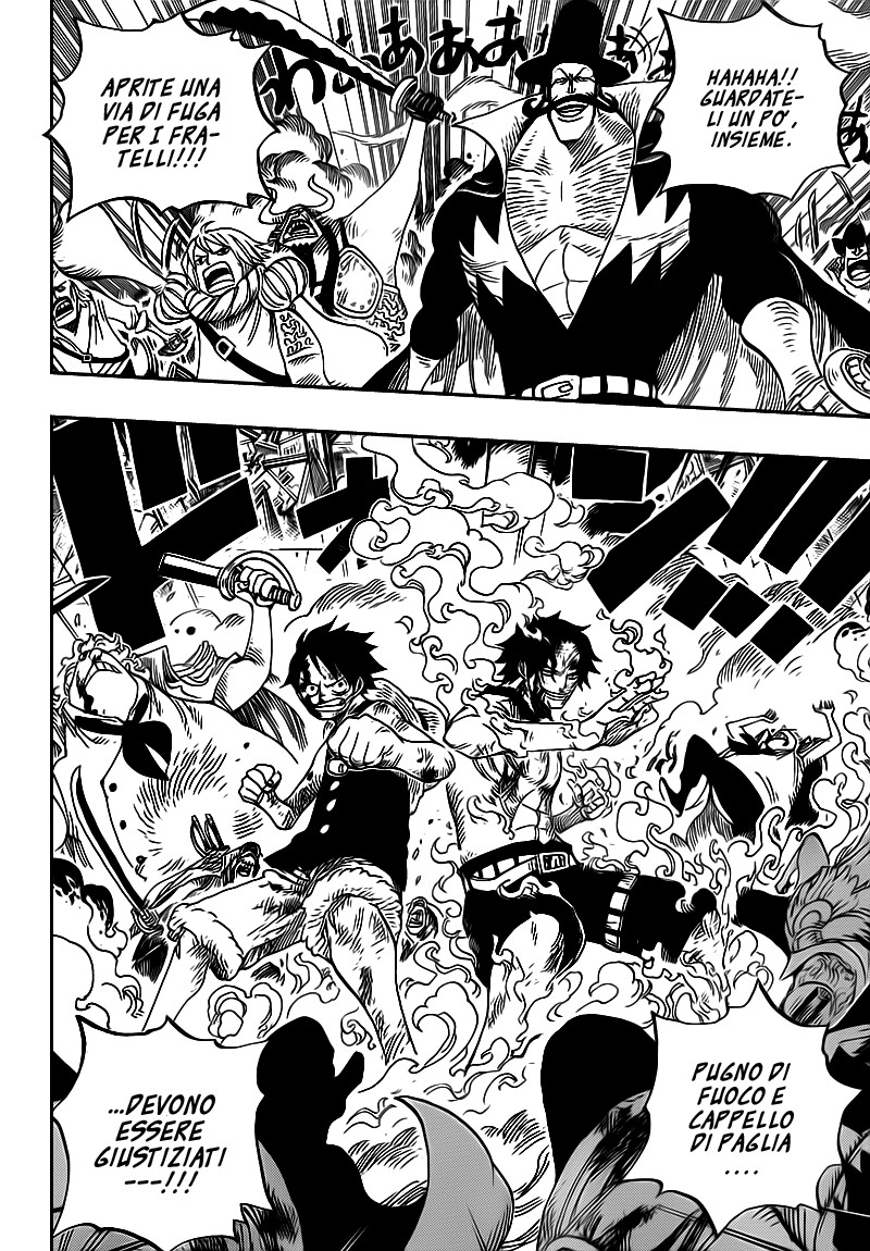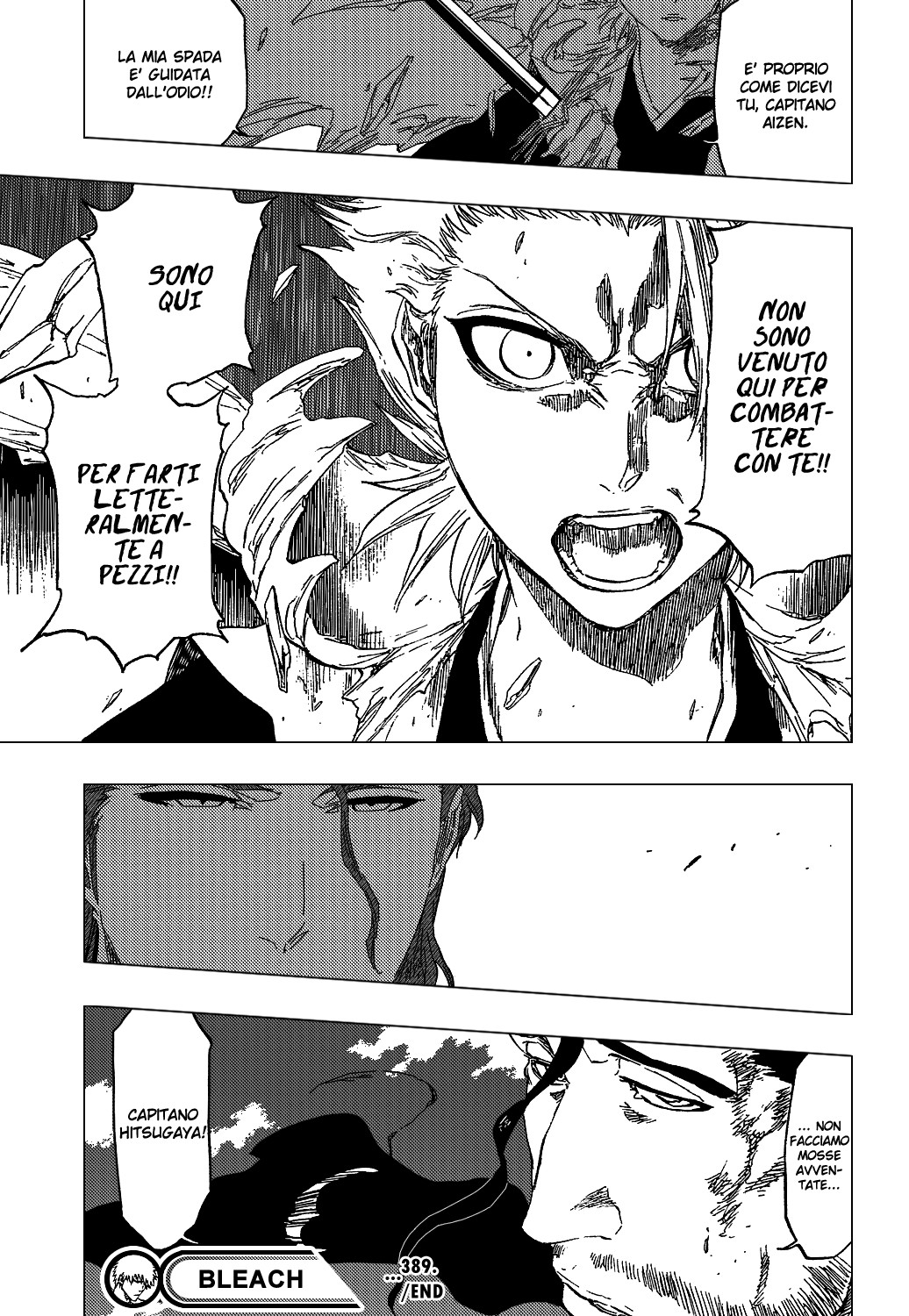 Riassunto: Alcuni Vizard e Capitani si riuniscono intorno a Ichigo per proteggerlo da Aizen. E’ Hitsugaya a fare la prima mossa attaccando frontalmente Aizen coadiuvato dal Capitano Kyoraku. Nel frattempo il Capitano Komamura ringrazia Ichigo di essere arrivato in tempo per affrontare Aizen perchè non se fosse arrivato in tempo, avrebbe attaccato lui stesso Aizen in preda ad un attacco di follia andando a perdere quindi la vita. Hirako è dispiaciuto del fatto che non si sia portato con lui Orihime per la sua straordinaria capacità di guarigione ma non si può lamentare visto che Ichigo è ritornato dall’Hueco Mundo con il Capitano Unohana il che, a detta di lui, potrebbe essere ancora essere più utile di Orihime. Il Capitano Soifon sprona Ichigo a dare tutto sè stesso per sconfiggere Aizen per la propria sopravvivenza e per salvare il mondo da colui. Hitsugaya rimprovera ad Aizen che combattere con la lama piena di odio è soltanto un’atto di violenza e non è quindi degno di essere Capitano. Ma Aizen, come risposta, lo provoca tirando fuori il nome di Inamori ed a quel punto Hitsugaya perde le staffe andando subito ad attivare il Bankai. Il capitolo si conclude con il Capitano Hitsugaya in procinto di voler far a pezzi Aizen mentre il Capitano Kyoraku cerca di calmarlo.