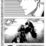 Riassunto: Il capitolo si apre con lo sguardo impietrito di Ichigo alla caduta dei suoi compagni ad opera di un Aizen apparentemente impossibile da fermare. Neanche la trasformazione in Hollow da parte di alcuni Vizard basta per mettere in minima difficoltà Aizen, anzi quest’ultimo deride la loro trasformazione definendoli dei “Pseudo-arrancar”. Interviene a questo punto il Capitano Soifon, con la quale Aizen fa uno scambio di battute assai provocatorie. Soifon, come tutta risposta, crea dei cloni di sè stessa, e in un attacco combinato con il Capitano Hitsugaya, si appresta a colpire Aizen. Ma Aizen riesce tranquillamente ad annullare il suo attacco con il suo semplice reiatsu. Sta per darle il colpo di grazia ma interviene a sorpresa il Capitano Kyoraku che riesce a fermarlo con il suo Shikai, mentre nel frattempo anche Shinji usa il suo Shikai su Aizen in modo da permettere al Capitano Hitsugaya di sferrare un colpo ad Aizen. Il capitolo si conclude con la shockante immagine di un Aizen colpito in pieno petto da parte del Capitano Hitsugaya.
