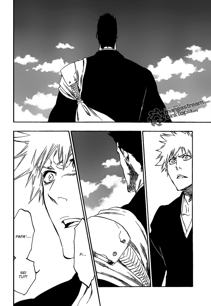 Riassunto: Il buon vecchio paparino Ishin arriva e save the day! Dopo una breve zuffetta con il suo primogenito (e quando mai non perde occassione per allestire un mini incontro di Wrestling?) i due si fermano un momento a parlare: ci sarebbero segreti da rivelare, cose da dire, verità troppo a lungo taciute da scoprire… tuttavia non è questo il luogo né il momento! Ora bisogna affrontare e fermare Aizen, bloccare la follia del più letale degli Shinigami e portare la pace a Karakura. Ma ecco che, dopo essere rimasto a lungo ad osservare in silenzio, il più perfido degli Shinigami scende in campo: Ichimaru Gin, ex capitano della Terza Brigata del Gotei Tredici è deciso ad intervenire, finalmente, in aiuto del suo mentore! E quale occasione migliore che quella di affrontare Ichigo in uno scontro mortale? Mentre Ishin si scaglia contro Aizen, mettendolo alle strette, Ichigo si prepara ad affrontare un Gin annoiato che, deciso a rendere lo scontro il più interessante possibile, chiude il capitolo con una semplice e devastante parola: Bankai!