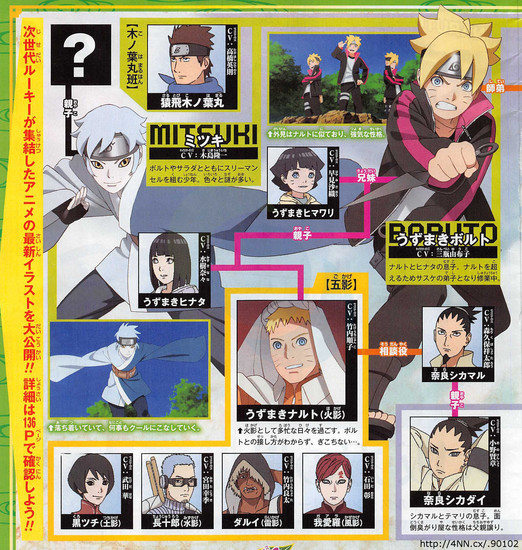 Con la pubblicazione del 32esimo numero di quest’anno della rivista Weekly Shonen Jump edita dalla Shueisha sono stati annunciati i nomi di nuovi membri del cast che presteranno le proprie voci ai personaggi del lungometraggio d’animazione di Boruto -Naruto the Movie-. Si tratta di Chie Nakamura nei panni di Sakura Uchiha, Satoshi Hino in quelli di Sai, Yoichi Masukawa in quelli di Rock Lee, Hidenori Takahashi in quelli di Konohamaru Sarutobi, Nana Mizuki in quelli di Hinata Uzumaki, Showtaro Morikubo in quelli di Shikamaru Nara, Hana Takeda in quelli di Kurotsuchi (Tsuchikage), Kouki Miyata in quelli di Chōjūrō (Mizukage), Ryota Takeuchi in quelli di Darui (Raikage) e Akira Ishida in quelli di Gaara (Kazekage).