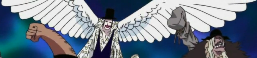 Delle 5 persone sopracitate ufficialmente ne conosciamo solo una, Pell, che ha mangiato l’Avis Avis modello Falco. Ci sarebbe un altro modello di Avis Avis, modello aquila, ma è comparso solo nell’undicesimo movie (che io sinceramente non ho mai avuto il coraggio di guardare) e faccio fatica a considerarlo ufficiale. Altre due persone dovrebbero entrare a pieno titolo in questa categoria: Marco e Lafitte. Il primo ufficiale della ciurma di Barbabianca possiede uno Zoo Zoo mitologico modello fenice di non si sa quale categoria, ma è assai probabile sia anch’esso un Avis Avis, mentre per Lafitte non abbiamo visto nient’altro che uno splendido paio di ali bianche ed è difficile capire di che cosa (angelo?, albatros?). La quarta potrebbe proprio essere la donna vista da Usop, che magari possiede un altro Zoo Zoo mitologico modello Arpia.