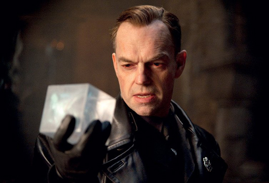 Troviamo quindi nell’Europa dilaniata dai mortai e dalle bombe il gerarca nazista Johann Schmidt alla ricerca di un manufatto extradimensionale in grado di rovesciare le sorti della guerra, dietro il volto dell’attore che lo interpreta, Hugo Weaving (Matrix, Lord of The Ring), si nasconde però un volto scarnificato e rosso che autorizza i suoi sottoposti a chiamarlo “Teschio Rosso”.