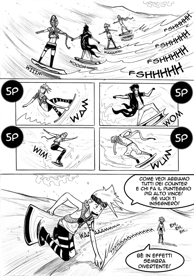 Facciamo perciò la conoscenza di Kayst, Luis (detto Prof) e Jacky il trio amico di Wifer e compagni di “Desert Surf” o meglio così ho ribattezzato io il gioco che i quattro intraprendono come allenamento forse e come dimostrativo per la sorpresa Rayko, ancora piena di domande ma affascinata stavolta dal gioco rocambolesco.