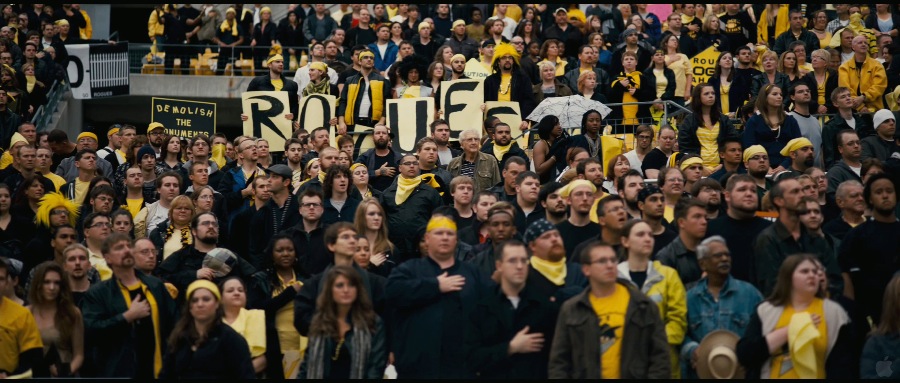 Partendo dalla partita di football americano, i fans più agguerriti del cavaliere oscuro potranno scorgere subito, tra gli spalti, un gruppo di persone che regge le leggere della squadra (I “Rogue” di Gotham City) e che la R è disegnata come il simbolo che per anni ha contraddistinto la spalla di Bruce, quel Robin di cui tanto si parlava e che alla fine è stato escluso dal lungometraggio.