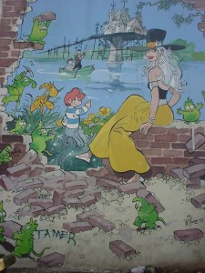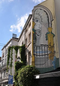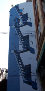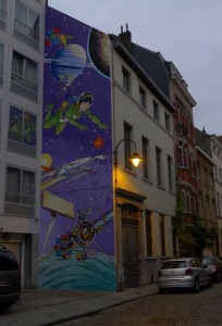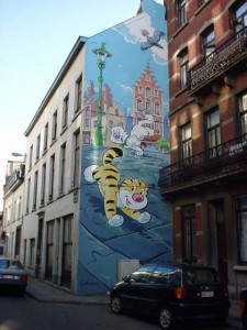 Ma passiamo a qualcosa di più allegro. Dicevo, Bruxelles, capitale europea molto bella, piena di storia e di monumenti, ma non è solo questo. A quanto pare, questa città ha dato i natali e ha ospitato alcuni dei più grandi fumettisti del mondo come: Morris (Lucky Luke), Peyo (I Puffi), Hergè (Tin Tin), Franquin (Gaston Lagaffe). Per celebrare questa grande passione per il fumetto e soprattutto per celebrare il “Museo del Fumetto” di Bruxelles, che conta una biblioteca con più di 25000 volumi, alcuni street artist hanno deciso di abbellire i muri della città con delle immagini che ritraggono i personaggi principali dei fumetti belgi più famosi.