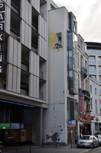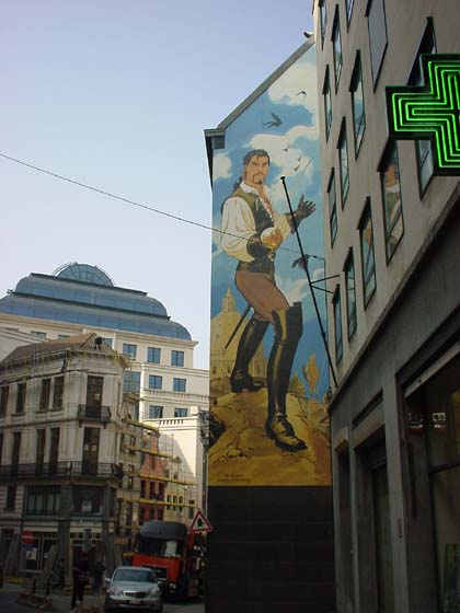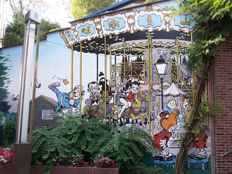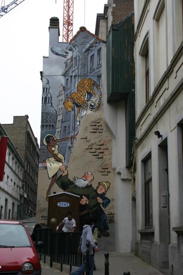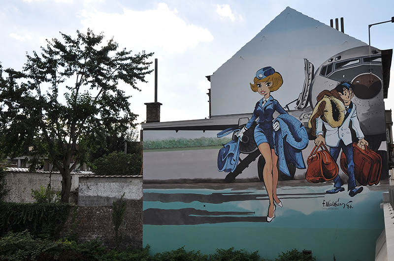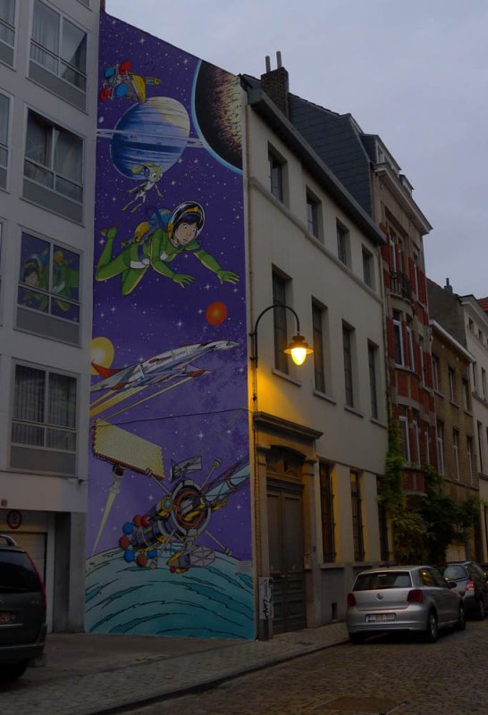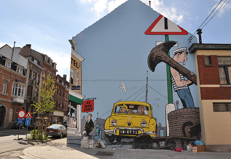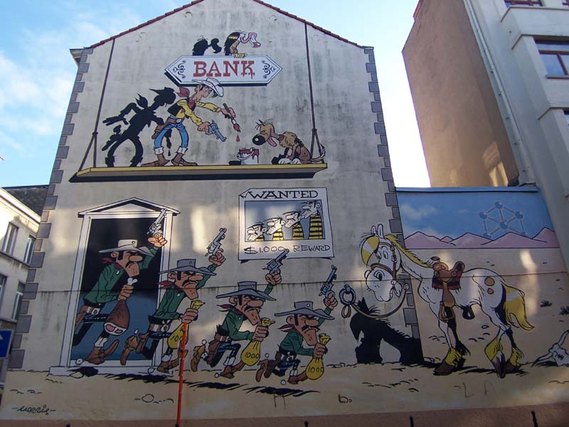 Ma passiamo a qualcosa di più allegro. Dicevo, Bruxelles, capitale europea molto bella, piena di storia e di monumenti, ma non è solo questo. A quanto pare, questa città ha dato i natali e ha ospitato alcuni dei più grandi fumettisti del mondo come: Morris (Lucky Luke), Peyo (I Puffi), Hergè (Tin Tin), Franquin (Gaston Lagaffe). Per celebrare questa grande passione per il fumetto e soprattutto per celebrare il “Museo del Fumetto” di Bruxelles, che conta una biblioteca con più di 25000 volumi, alcuni street artist hanno deciso di abbellire i muri della città con delle immagini che ritraggono i personaggi principali dei fumetti belgi più famosi.