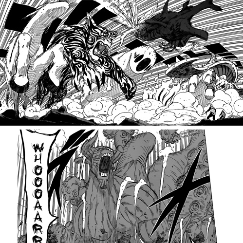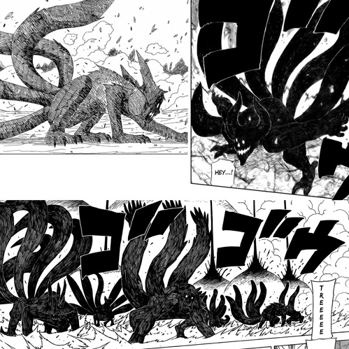 La forma Completa di Naruto infine sembra essere molto particolare, in quanto è composta da chakra “informe” e che non prende le sembianze reali del demone (ad esempio è trasparente): a tal proposito Kurama dice che la relazione Demone-Portatore non è ancora stabile, è questo l’unico motivo o c’è dell’altro? I Sigilli che compaiono sul “corpo” della volpe hanno sicuramente un motivo d’essere, probabilmente è solo il Sigillo Ottagonale che si estende, ma non ne sono affatto sicuro.
