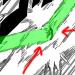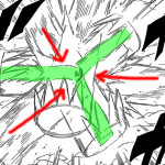 Innanzitutto, come funziona la tecnica “Elefante della Sera“? Le immagini a volte non bastano, come in questo caso, e ragionarci sopra è essenziale. La tecnica è una diretta evoluzione delle precedenti, “Pavone del Mattino” e “Tigre di Mezzogiorno“. Gai, acquisita una potenza eccezionale ed una capacità fisica disumana, ci ha mostrato che con l’apertura della Sesta Porta riesce a colpire l’aria così velocemente e con così tanta forza da incendiarla all’istante e lanciare queste palle di fuococontro l’avversario a distanza ravvicinata o a media distanza, come un meteorite che attraversa l’atmosfera terrestre. Con la Settima Porta è in grado di lanciare un diretto talmente potente da respingere l’aria e comprimerla in una forma piccolissima, che raggiunta una soglia limite collassa ed esplode (a qualcuno ricorderà l’Ursus Shock di Orso Bartolomeo, da One Piece). L’ultima tecnica mostrata è una diretta evoluzione delle precedenti. Con l’Ottava Porta Gai ragiungge un livello superumano eccezionale ed i suoi colpi respingono l’aria come fosse un ventilatore/compressore di potenza smisurata (e questo a chi legge Hunter x Hunter ricorderà lo Hykushiki Kannon di Netero, quando utilizzato nella forma iniziale). Nel capitolo conclusosi Gai, calciando l’aria (ancora una volta la cosa ricorda One Piece, il Geppo della CP9 in particolare) corre vorticosamente attorno a Madar che si trova a mezz’aria. Mentre si muove a velocità incalcolabile attorno al nemico sferra i suoi “Soku”, Issoku, Nisoku, Sansoku, Yosoku e Gosoku i quali intrappolano Madara in una morsa di pressione, infatti leggiamo che non riesce a muoversi. Tecnica molto semplice quindi, ma non per questo meno spaventosa. Inizialmente Gai aveva colpito Madara con un colpo che lo aveva piantato nel terreno a decine di metri di profondità (forse centinaia), il piano iniziale sembra chiaro fosse colpirlo ripetutamente mentre questi si trovava a terra ed usare la sua immobilità per distruggerlo fisicamente. Credo che, rispetto al colpirlo in aria, avrebbe potuto provocare molti più danni di quelli attuali, vista la resistenza che avrebbe opposto il terreno stesso. Vi lascio ora ad una serie di immagini editate che spiegano bene come e perchè Madara viene colpito nonostante lo scudo impenetrabile, questo a causa del fatto che la “zona di quiete” (in verde) deve essere opposta alla direzione del colpo ed all’orientamento dello scudo, e Madara non ha fatto in tempo ad orientarlo: è come se piovesse da tutte le direzioni nello stesso momento, sarebbe impossibile orientare l’ombrello.