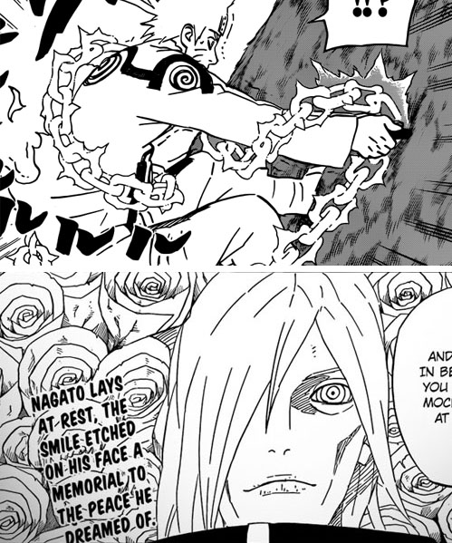 Veniamo infine alle loro abilità, a cui ho accennato in precedenza. Sappiamo che erano abilissimi nei nei Fuinjutsu, veniva inoltre descritto come il “clan dalla lunga vita” ed i suoi membri avevano una vitalità tale da sopravvivere all’estrazione di un cercoterio, alcuni di loro possedevano abilità rigenerative incredibili (Karin sarebbe dovuta morire dopo la ferita subita da Sasuke, con o senza le cure di Sakura). Tutte queste capacità credo si possano rifare ad una sorta di abilità innata condivisa in parte coi Senju, come lo sono i doujutsu Sharingan e Byakugan per Uchiha e Hyuga. Se dovesse esistere tale Kekkei Genkai, avrebbe essa un organo preposto a tale funzione oppure no? Altri clan posseggono una parte del corpo atta all’utilizzo dell’abilità innata, le ossa per lo Shykotsumyaku del clan Kaguya ad esempio (anche se lo scheletro non è propriamente un organo). Da tempo ho formulato un’ipotesi, ovvero che il cuore è per i Senju (e quindi anche per gli Uzumaki) come l’occhio è per Uchiha e Hyuga. Potrebbe essere una prova di ciò il fatto che Madara ha subito una “modifica” da Kabuto proprio in quella parte del corpo? In alternativa, l’intero corpo degli Uzumaki sarebbe portatore di questa abilità, proprio come la leggenda dell’Eremita suggerisce, ma in tal caso non credo basti impiantarsi poche cellule Uzumaki/Senju per diventare un surrogato del Rikudo. C’è infine un’abilità riconosciuta ai soli Uzumaki, o meglio ad uno di essi: le catene di chakra che utilizza Kushina. Esse come sappiamo sono in grado di imprigionare un Cercoterio e di creare delle barriere (che respingono chiunque, demone o essere umano), oltre a consentirle di riassorbire e rinchiudere il Biju all’interno del proprio corpo. La stessa abilità è stata poi utilizzata da Obito, sfruttando le sbarre nere del Gedou Mazo come tramite per poter attivare la tecnica. Sospetto che il vincolo delle sbarre sia per sopperire alla mancanza di chakra/corpo Uzumaki od alla non appartenenza a tale clan e questo potrebbe suggerire che si tratti proprio di un’abilità innata e non di una “semplice” tecnica, altrimenti l’avrebbe potuta utilizzare senza restrizioni. A questo punto mi chiedo se e come questo clan e la Statua Demoniaca sono legati.