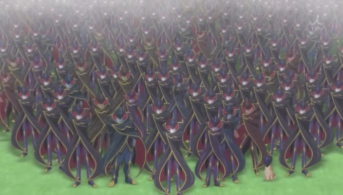 A quel punto si alza una cortina fumogena su tutti gli 11 presenti, ed i Knights of Rounds e gli altri Knightmare presenti si preparano ad attaccare. Suzaku tuttavia dice loro di stare fermi poichè gli 11 non hanno ancora fatto niente. Quando si dissipa il fumo, Suzaku e gli altri si ritrovano davanti un milione di Zero. Lo Zero sullo schermo quindi ordina a tutti gli altri Zero di accettare l’esilio e di partire subito.