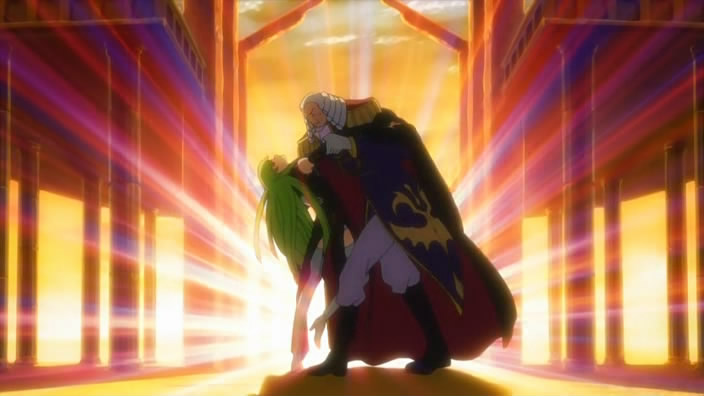 L’Imperatore chiede a Zero perchè continui a mentire e cosa abbia ottenuto in realtà con il Geass. Fa notare al figlio che non può neanche mostrare il vero sè stesso ai suoi amici per via del Geass, anche se lo vorrebbe. Charles continua dicendo che tutta l’umanità in realtà è un unica persona. Lelouch non capisce, ma in quel momento arriva C.C. che dice a Charles che ormai Lelouch non ha più valore e che non ha bisogno di usarlo per arrivare a lei. C.C. quindi chiede a Charles di esaudire il suo desiderio e spiega a Lelouch che lei vuole solo morire. C.C. dice a Lelouch inoltre che il destino dei possessori del Geass è uccidere la persona con cui stringono il patto. Lelouch continua a non capire, C.C. gli dice che se lui la uccidesse ora otterrebbe lo stesso potere di Charles, ma Lelouch si rifiuta. C.C. quindi lo scaraventa fuori da quella dimensione.
