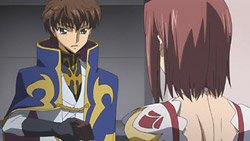 A questo punto i cavalieri neri possono concentrare la potenza di fuoco su V.V. che precipita al suolo. Ferito, egli striscia verso la porta del culto ma viene incrociato dall’Imperatore che gli chiede se V.V. abbia mandato un assassino per uccidere Lelouch. Alla risposta affermativa risponde con “mi hai mentito di nuovo fratello”. (strana risposta non trovate? )