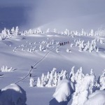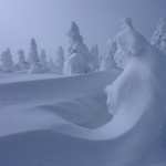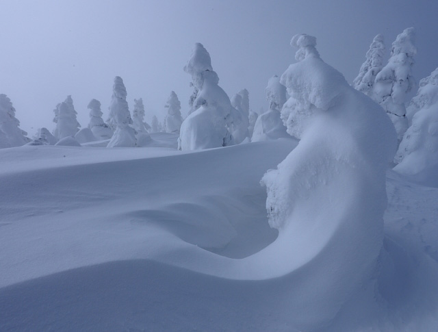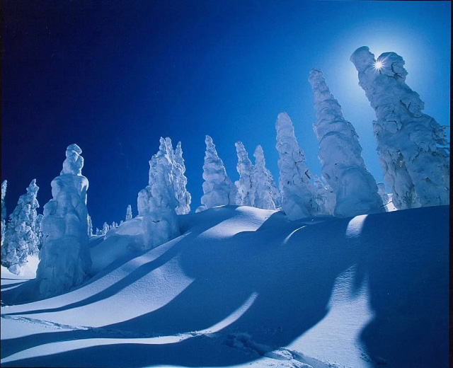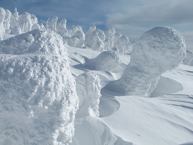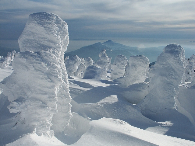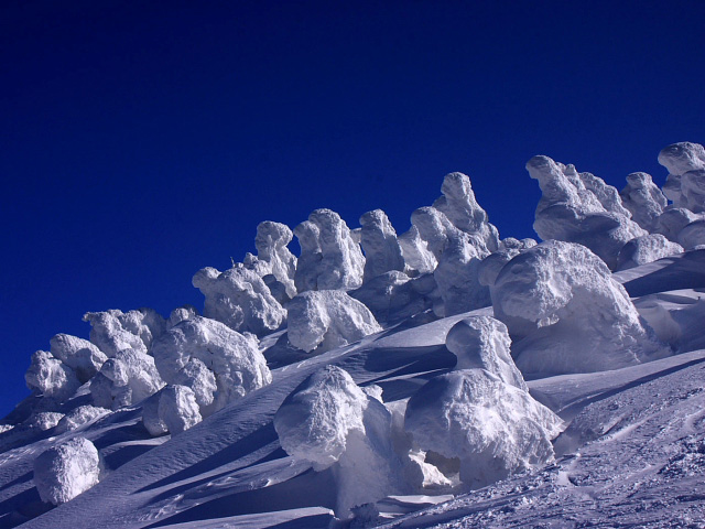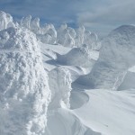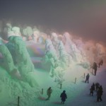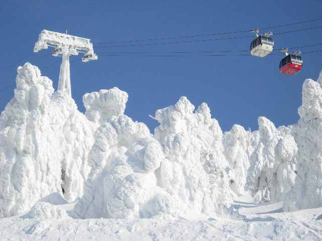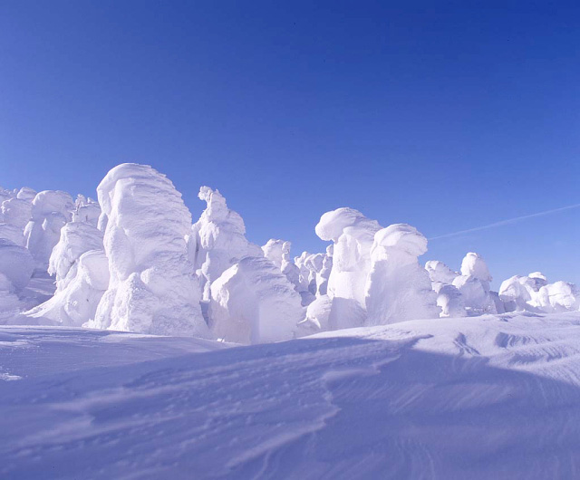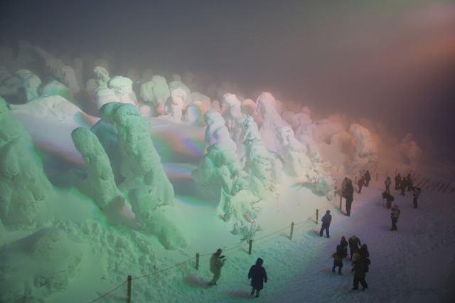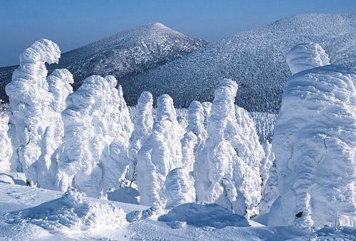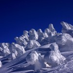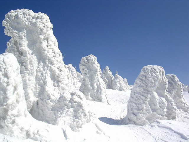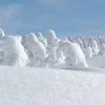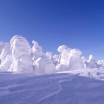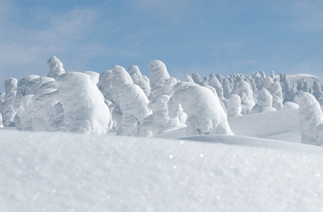 Le immagini di seguito vengono dalle regioni a nord del Giappone sottostanti all’Hokkaido, più precisamente nelle prefetture di Akita, Aomori, Yamagata, Miyagi e Fukushima. Le foto, dobbiamo dirlo, sono spettacolari e devono la loro bellezza incontaminata ad un fenomeno che nel mondo ha molti nomi, in inglese hard rime e in italiano è chiamata calabrosa. Questa è una particolare sedimentazione di ghiaccio che si verifica quando, in particolari condizioni, le particelle d’acqua che formano la nebbia ad una temperatura inferiore allo 0°C si depositano sugli alberi, e non necessariamente solo su quelli. Il risultato che si ottiene sono queste candide immagini di ghiaccio e neve che si ingigantiscono man mano che il vento aumenta d’intensità.