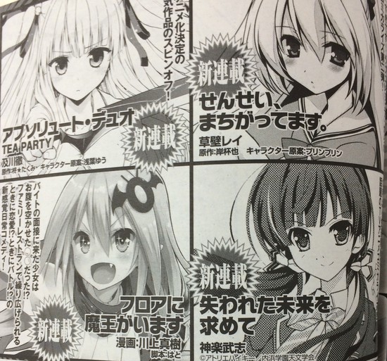 I nuovi manga includono uno spinoff della serie di light novel Absolute Duo di Takumi Hiiragi-Boshi e del character designer Yū Asaba. Tōru Oikawa (Shin Sekai Yori – From the New World) disegnerà il manga, umoristico e nel classico formato di quattro pannelli, intitolato Absolute Duo Tea Party.