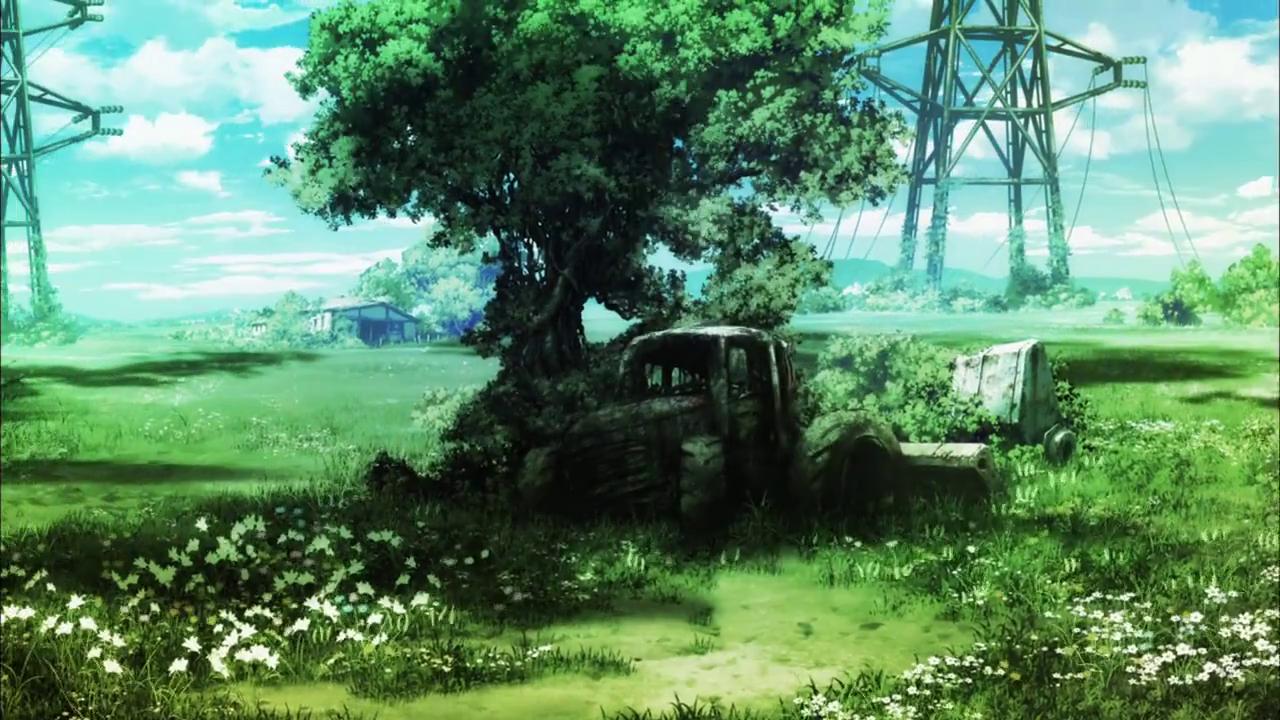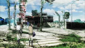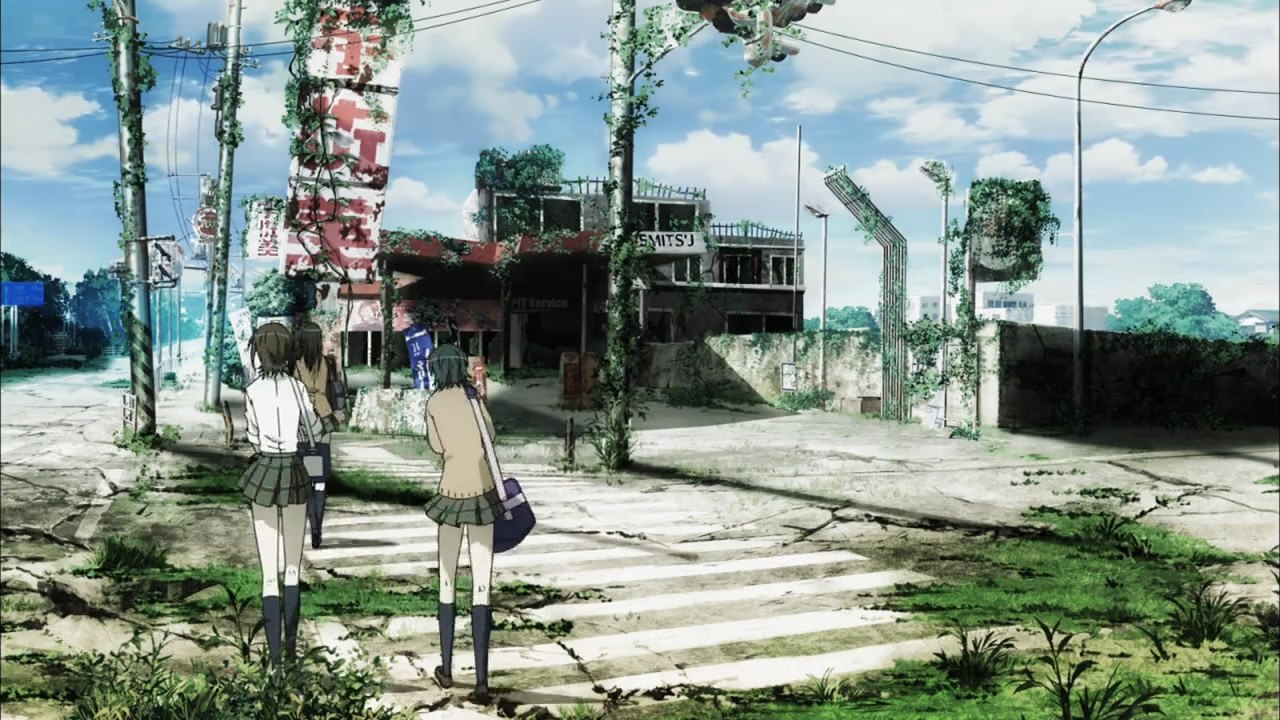 Aldilà delle tre ragazze in divisa scolastica, le tre protagoniste di questa vicenda, figure che sono oramai un appeal quasi necessario nell’animazione giapponese (con lunghe e ampie inquadrature delle loro gambe e gonne mosse dal vento; ma di mutande non se ne vedono; vi ricordo che Suzuki ha firmato anche Seitokai Yakuindomo), Coppelion è un anime che consiglio per la sua capacità di trasportarvi in un’esperienza “visiva” particolarmente affascinante: la caratteristica che rende questo anime “bello da vedere” sono i fondali, gli ambienti, i palazzi decadenti coperti di vegetazione. Una città rovinosa, in cui non ci sono forme di vita (umana) e in cui gli effetti dell’abbandono sono visibilissimi, bellissimi, al punto che in alcuni punti ho messo in pausa per osservarli per bene. Se vi affascina l’urbanistica, la costruzione di scenari e ambienti Coppelion è qualcosa che potreste decisamente gradire, indipendentemente dalla trama. Unica vera pecca che ho notato, ma legata soprattutto a quelli che sono i miei gusti personali, è l’eccessivo risalto che viene dato alle figure umane per creare il contrasto (soprattutto quando le animazioni si fanno elaborate) attraverso l’uso di spessi bordi neri, che fortunatamente vengono meno nei primi piani. Una scelta tecnica inevitabile, poichè animare figure umane sotto fondali di questo genere è indubbiamente un’operazione che necessita una grande cura, e per fortuna, nonostante questo risalto, il risultato finale non è poi tanto male.